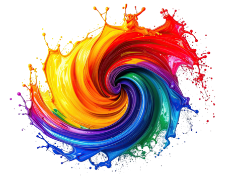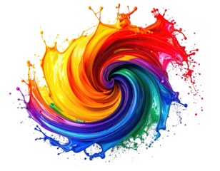 A swirling, colorful paint splash forming a vibrant rainbow, centered on a black background