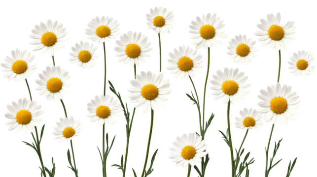 Blooming daisies with yellow centers, field flowers, cut out transparent