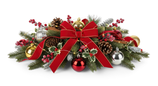 Christmas centerpiece with ornaments and pine needles festive holiday decoration isolated on transparent background