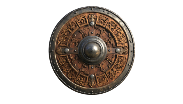 A round, ornate wooden shield with metal trim and central boss, isolated on black