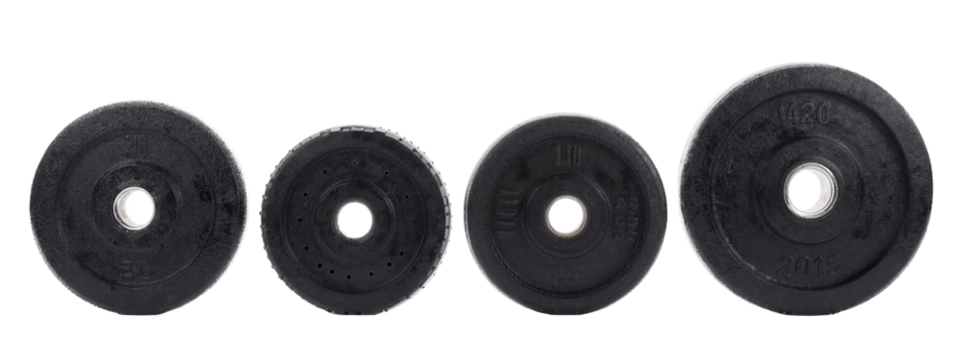 Four black, circular, textured metal washers with central holes, arranged horizontally . Each washer has a slightly different size and texture.