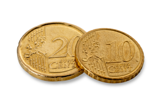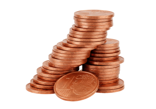 Isolated arrangement of bronze colored one cent euro coins stacked in various piles, money