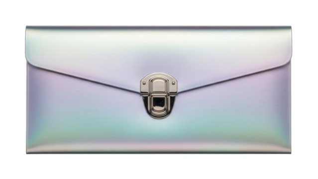 Iridescent clutch bag isolated PNG, holographic envelope purse with metal clasp on transparent background, fashion accessory for party or special occasion