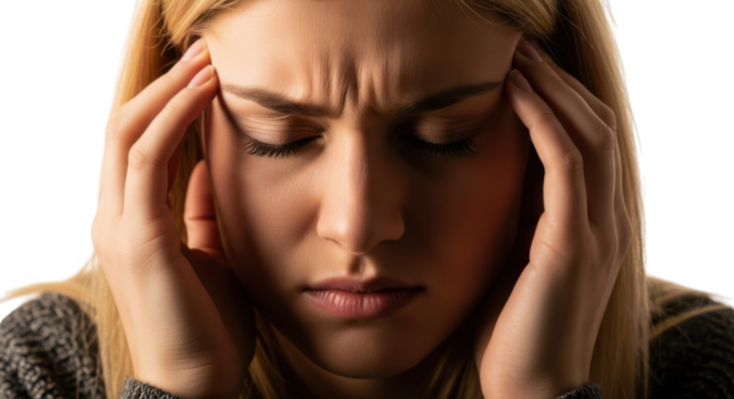 Stressed businesswoman holds her temples with a pained expression, suffering from a severe headache or migraine isolated on transparent background, png
