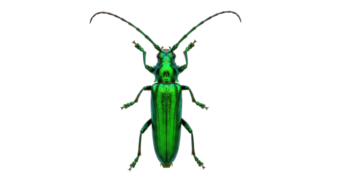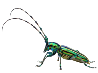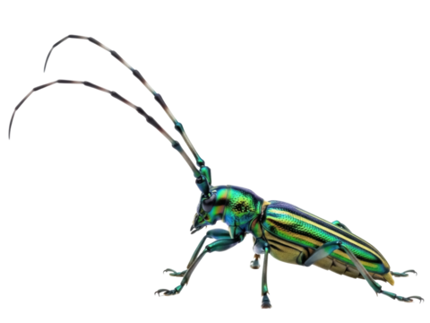 Isolated Metallic Green Longhorn Beetle, featuring vibrant iridescent colors and striking patterns