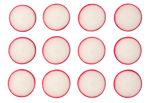 Rondelles de radis frais disposées en motif géométrique sur fond blanc