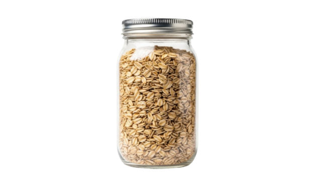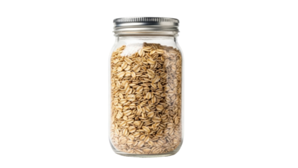 Isolated glass jar full of dry rolled oats, uncooked cereal grain food staple, close-up