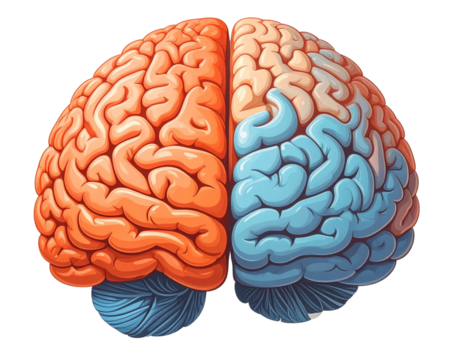 Cartoon-Style Brain with Orange and Blue Halves, Flat Vector Design, Isolated PNG