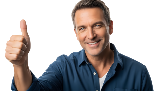 An attractive middle-aged man with gray hair gives a thumbs-up. His expression is of positivity, confidence and a gentle smile
