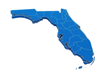 Meticulously detailed 3D rendering of the map of Florida in deep cerulean blue, sharp contours, isolated on transparent background with studio lighting, concept of geographical precision