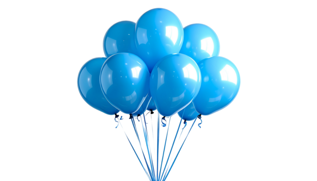 Bunch of bright, sky-blue balloons tied together against a stark black backdrop