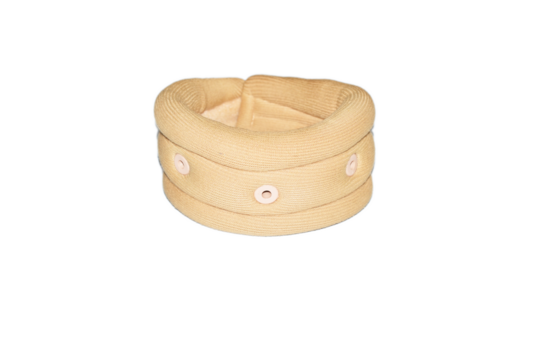 White, modern cervical collar floats on a black studio background. Ideal for product shots, medical brochures, or healthcare presentations.
