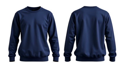 Front & back view of a navy blue crew neck sweatshirt on black background