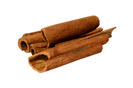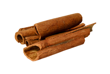 Cinnamon sticks isolated on transparent background. Three aromatic spice pieces close-up. Dried fragrant plant bark for cooking. Photo element for packaging design, advertising layout, cafe menu cover