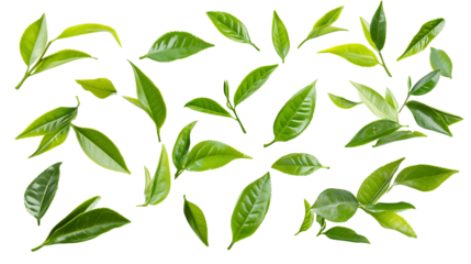 Green tea leaves sparkling with moisture, pristine and verdant, floating against transparent backdrop for design versatility