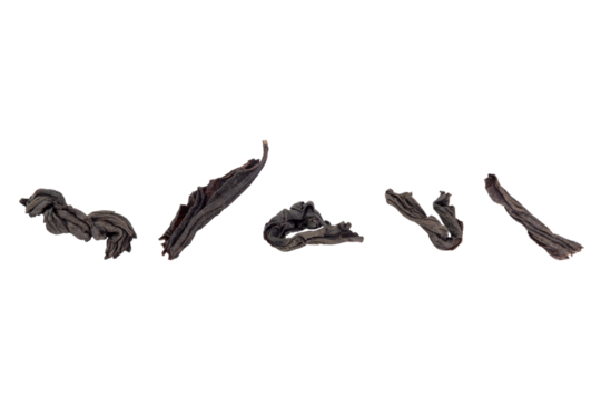 Set of dry black tea leaves isolated on a transparent background.