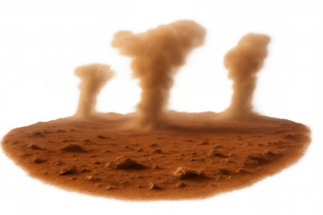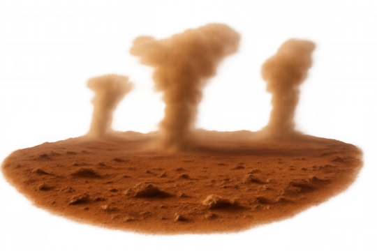 Reddish rocky landscape featuring multiple dust devils spinning, generating dynamic whirling motion against transparent backdrop