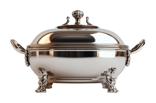 Stainless Steel Chafing Dish Warmer with Lid Open Showing Hot Food, isolated on transparent background PNG (2)