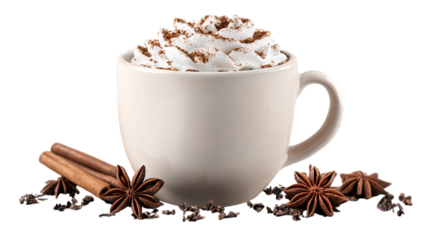 Spiced chai latte in rustic ceramic mug with cinnamon sticks and aromatic herbs isolated on transparent background