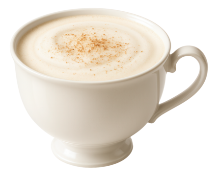 White chocolate chai latte in a porcelain teacup with frothy milk and a sprinkle of ground nutmeg