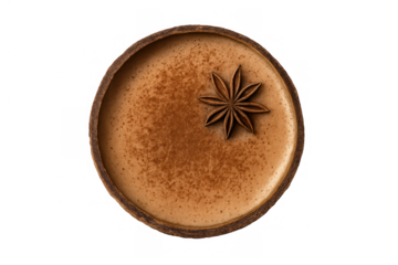 Warm chai latte in a rustic bowl, topped with star anise and cinnamon powder, inviting spice beverage concept