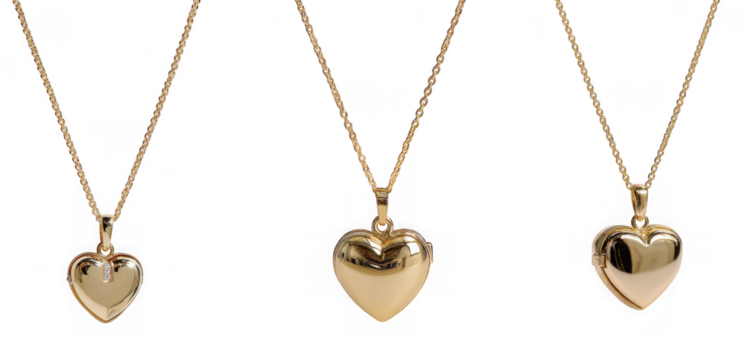 Three golden lockets shaped like hearts on delicate chains, isolated on transparent background