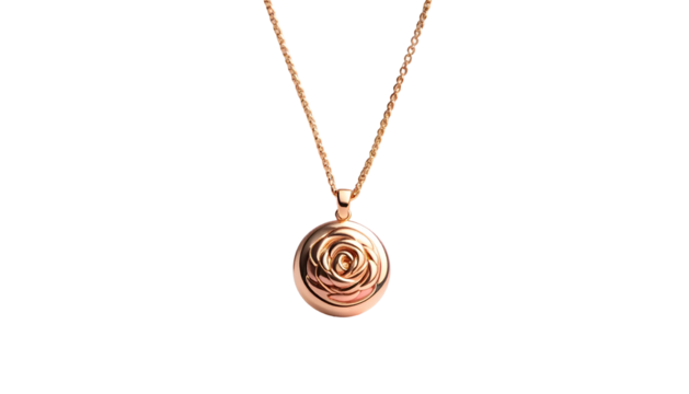 Gold chain necklace, pendant shaped like a rose flower on black