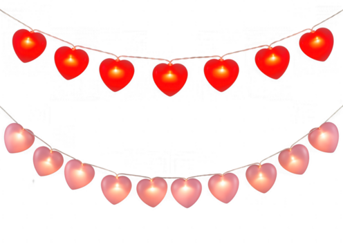 Heart string lights garlands arranged in two rows with glowing bulbs shaped like love symbols on white background for valentines day, wedding reception backdrop or romantic store decoration layout