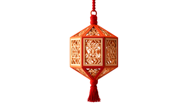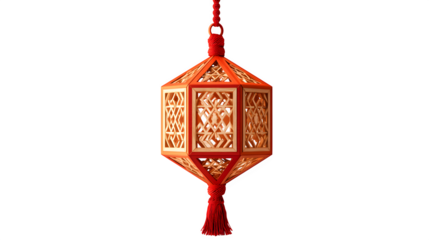 An isolated golden traditional Chinese New Year lantern pendant hangs like a luxury jewelry accessory featuring antique metal and glass ornaments on a vintage silver chain