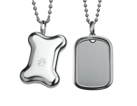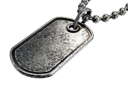 Silver military dog tag suspended from beaded chain, metallic surface gleaming against transparent backdrop