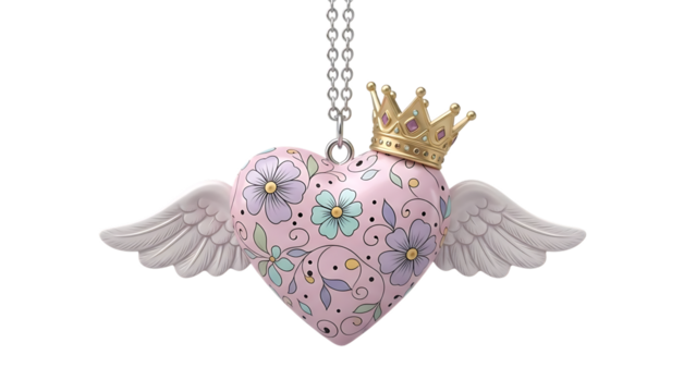 Beautiful pink floral heart necklace with crown and wings isolated on transparent background