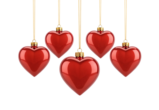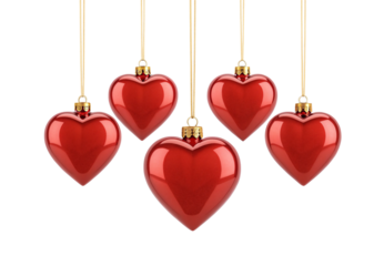 Five red heart baubles suspended on gold chains, isolated on a transparent background