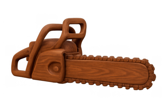 Wooden carved chainsaw on transparent background, artistic sculpture representing a powerful forestry tool and craftsmanship concept