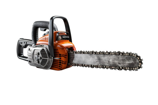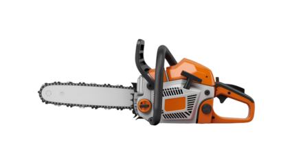 Orange chainsaw isolated on transparent background, ready for cutting wood