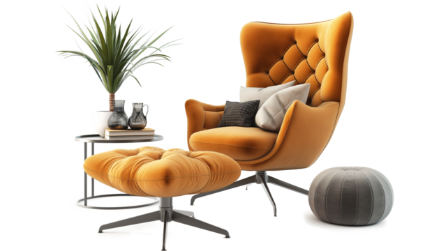 Chic Interior Design with Chair, ottoman, and pillows isolated on a transparent background