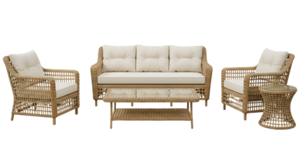 Isolated rattan patio furniture set with two chairs and round table on transparent background, outdoor wicker decor for summer design and lifestyle projects