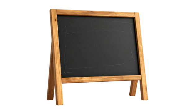Chalkboard message stand for indoor café signage — freestanding wooden menu board, modern décor, front view, isolated on transparent background cutout; ideal for coffee shop promotions