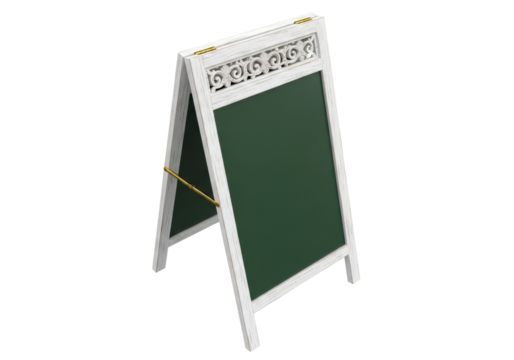 Close-up of an empty, black chalkboard with a distressed wooden frame, isolated on a transparent background, ready for custom text or graphics