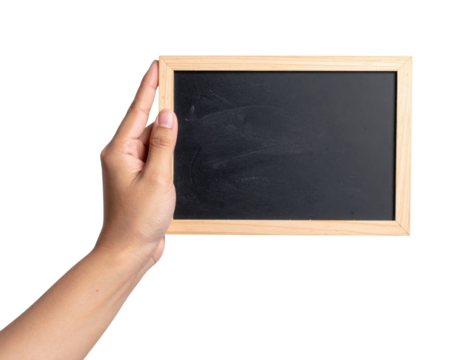 A hand holding a small, empty blackboard with a wooden frame against a black background.