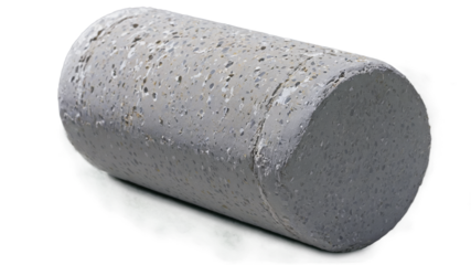 A solid chalky object with a rough and matte surface. Its shape resembles a cylinder and the color is predominantly a light grey with occasional speckles of darker shades.