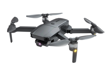Modern quadcopter design with folded props and compact form, isolated on transparent background.