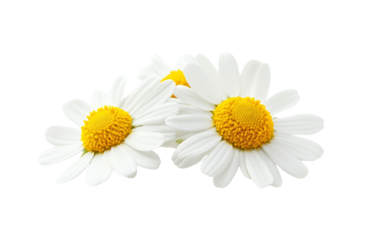 Chamomile Serenity: Three delicate chamomile flowers, showcasing their vibrant yellow centers and pristine white petals, create a serene and calming image. perfect for relaxation, wellness.
