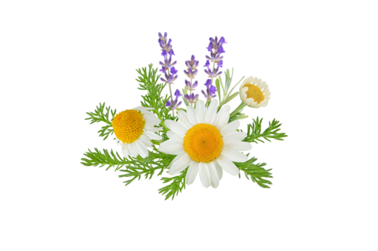 Chamomile and lavender flowers bunch isolated transparent png. White daisy in bloom and lavender branch. Chamaemelum nobile herbal and lavandula medicine plants.
