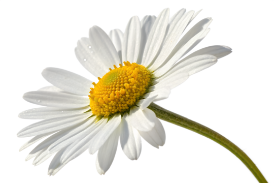 Classic white tea cup and saucer with golden chamomile tea and single daisy flower, isolated on a transparent background