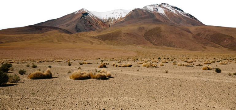 A rock formation in the desert. Light breed. Mountain with snow isolated on white background.