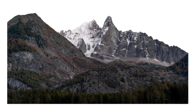 "Imposing mountain peaks with glistening snow-covered summits, isolated on a transparent background