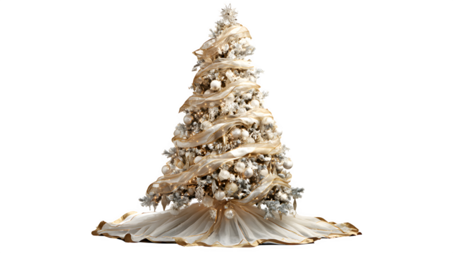 A luxurious Christmas tree, draped with cascading champagne gold satin ribbons and oversized, sparkling faux diamond ornaments. Glamorous, elegant, isolated on white background.