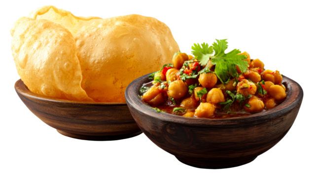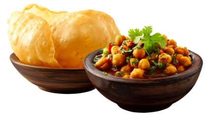 Chana masala and puri in wooden bowls, served, cut out transparent
