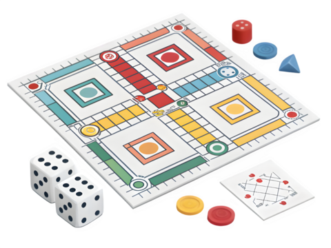 Classic board game with dice and colorful pawns on a black background
