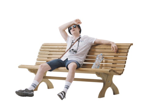 Middle-aged male tourist sitting on a bench, suffering from the heat. Concept of climate change.